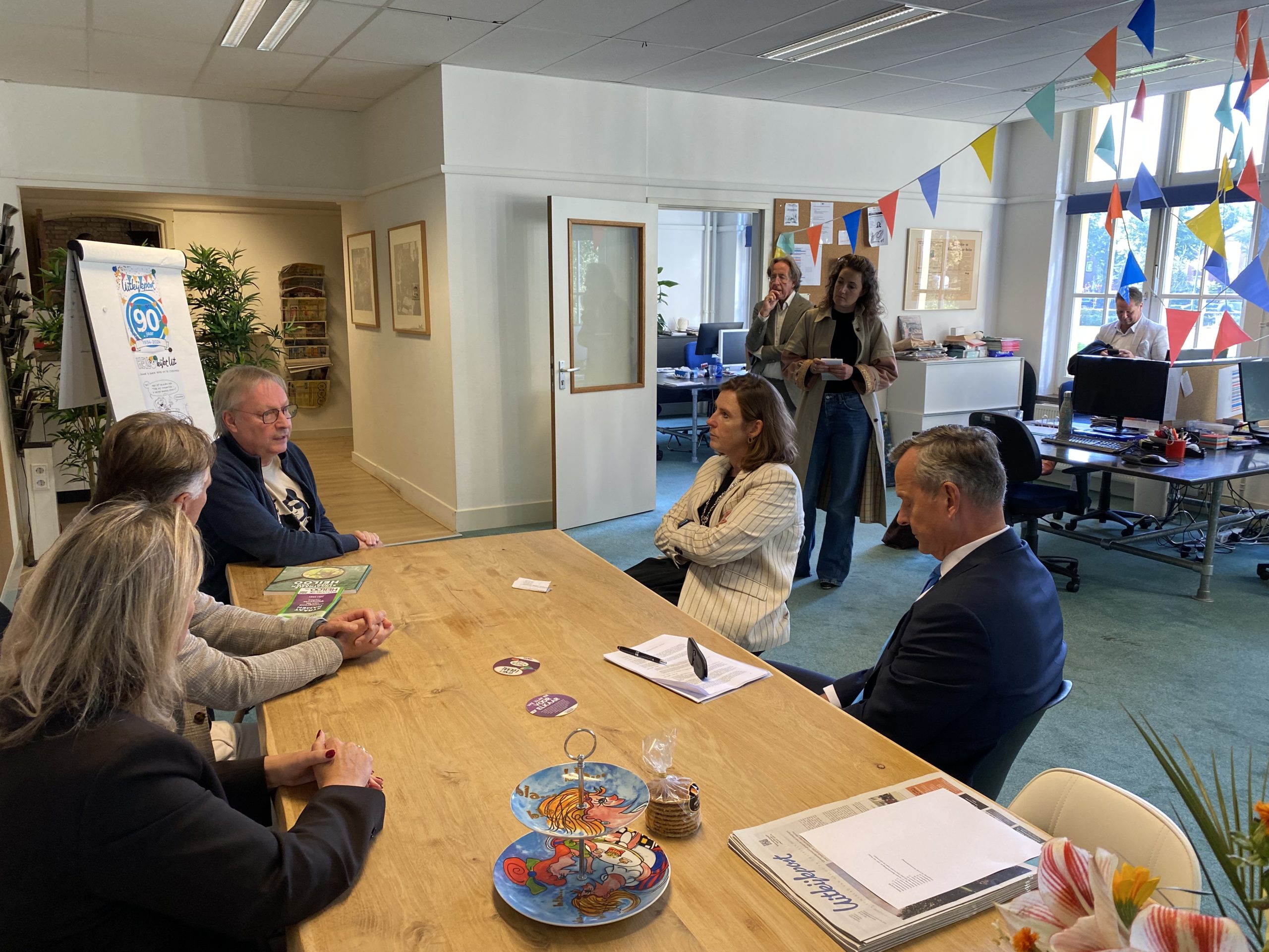 In de loop van de middag schoof Van Dijk in het WBC – de verzamelplek voor verschillende bedrijven – op de redactie van de Uitkijkpost aan bij drie ondernemers en leden van Ondernemend Heiloo. Mireille Kaptein, Thijs Smit en Marcel Keet spraken als ondernemers op de verschillende bedrijventerreinen (Boekelermeer en de Oude Werf) ook namens Ondernemend Heiloo. Met ruim 250 leden is OHO een sterk netwerk, waarin samenwerking en verbinding centraal staan. “In Heiloo gunnen ondernemers elkaar veel,” werd er benadrukt. “Het dorp kent veel dubbelfuncties en mensen met meerdere petten, maar dat werkt hier juist goed. Het dorpskarakter maakt dat we elkaar kennen, weten wanneer het petje op of af is, en daardoor soepel kunnen samenwerken.”